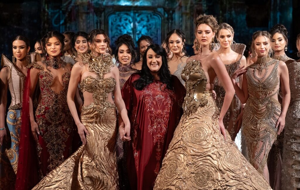 Dense gold jacquards, intricate hand-embroidered mesh, and lavish surface detailing appeared with deliberate precision. Embellishment traced silhouette lines rather than overwhelming them. Texture carried weight—visually and physically—creating garments that commanded posture.