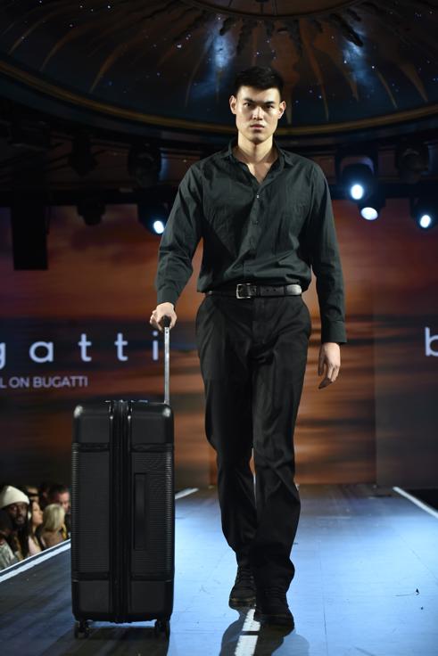 Many looks combine form-fitting bodysuits and leggings with oversized coats and travel accessories, creating what could be described as the “Airport Runway” silhouette. The idea feels intentionally transitional: part private jet arrival, part metropolitan street entrance.