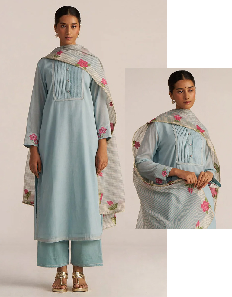 This monsoon kurta set has silver Kasab hand embroidery, which makes it a must-have. Particularly, the crochet lace on the dupatta makes it a deal-maker.