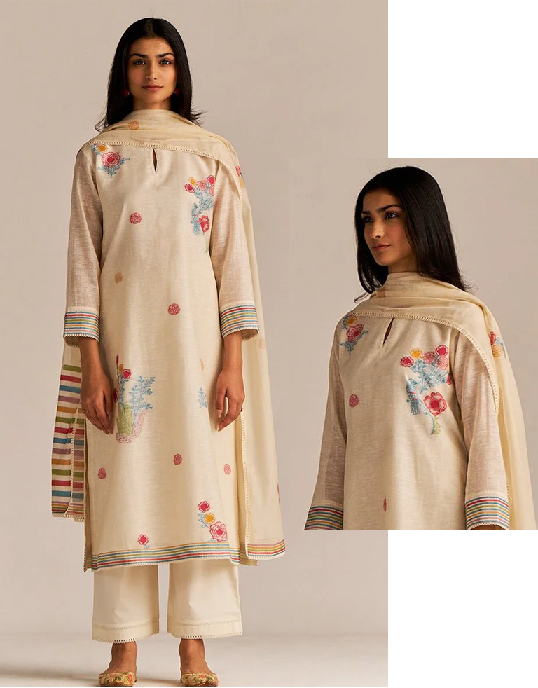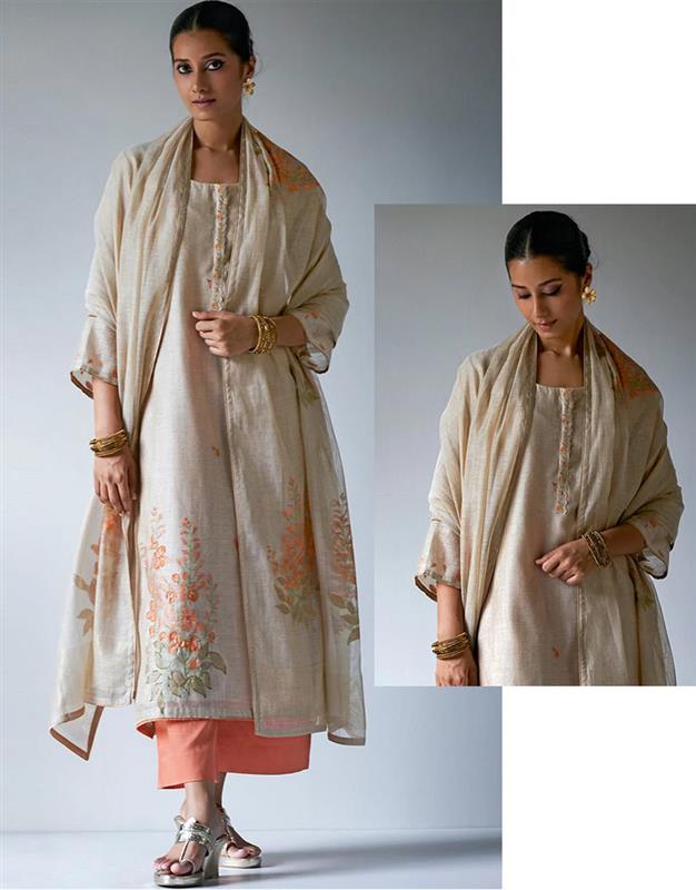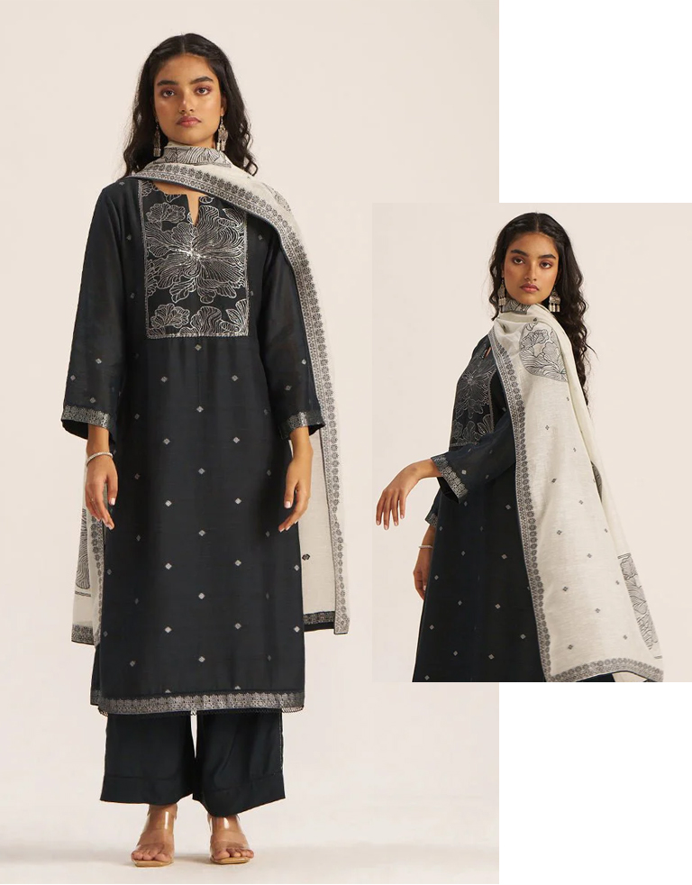 Searching for a look that matches your mood? Well, we have got you covered. It’s not white or grey, it’s black – aha! Silver zari woven flowers on kurta + off-white woven linen dupatta + 100% cotton bottom – What more can you ask for?