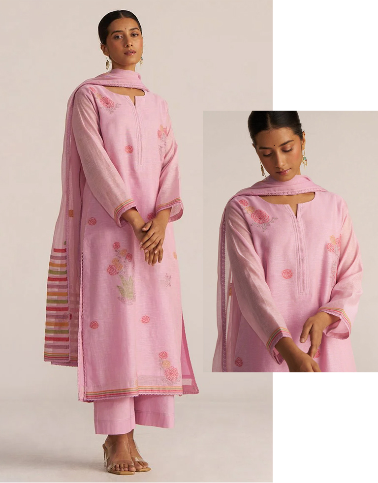 Wait, planning to wear light colors on a rainy day? Yes! Go ahead… Because this woven kurta set comes with a lining. And if that’s not convincing enough, have a look at the beautiful embroidery work and hand detailing done on a kurta, isn’t it heart-stealing?